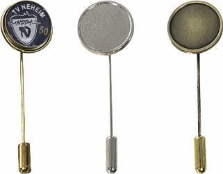 Anstecknadel/Anstecker und das 1,5cm Emblem aus Plexiglas mit Perlrand. Dies Emblem können wir individuell für Sie mit Ihrem Vereins-, Firmen- oder Veranstaltungslogo bzw. mit einem Foto und individuellen