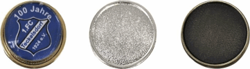 Anstecknadel/Anstecker und das 1,5cm Emblem aus Plexiglas mit Perlrand. Dies Emblem können wir individuell für Sie mit Ihrem Vereins-, Firmen- oder Veranstaltungslogo bzw. mit einem Foto und individuellen