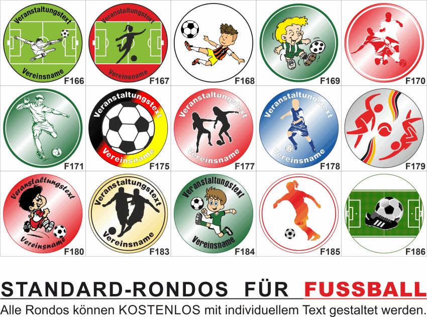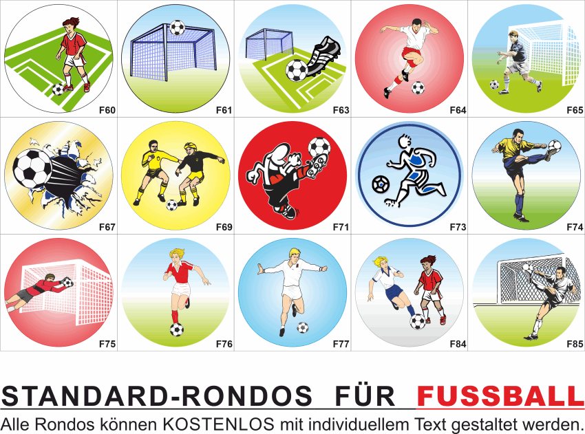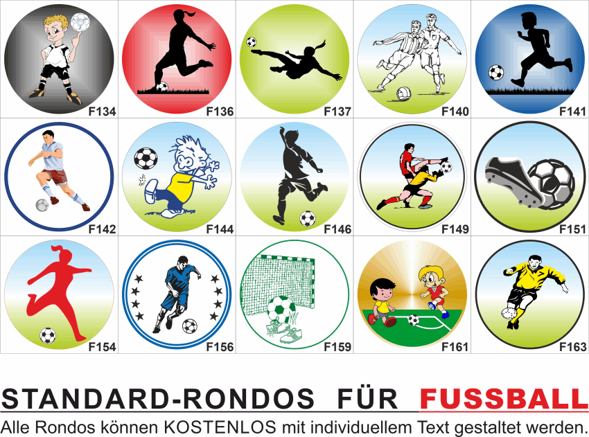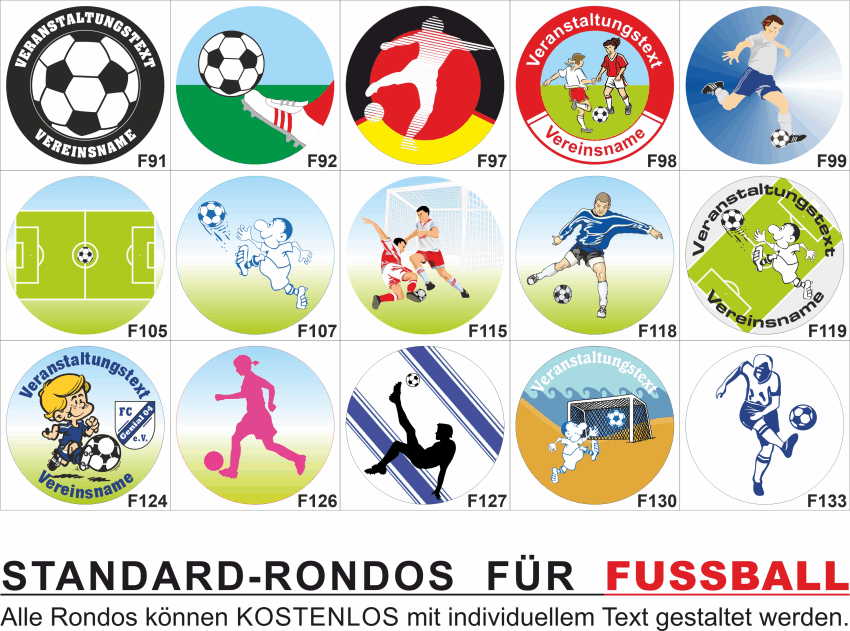 Es gibt viele Möglichkeiten ein Emblem zu gestalten. Hier finden sie eine Übersicht unserer FUSSBALL Standard-Embleme bei denen wir Ihnen gerne kostenlos einen Text rundum setzen. Geben sie bei Ihrer Bestellung einfach die gewünschte Emblem Nummer mit an und sie erhalten einen kostenlosen Korrekturabzug des Emblem-Layouts.