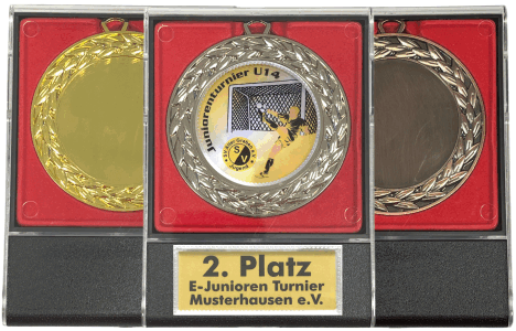 Firmen- oder Veranstaltungslogo bzw. mit einem Foto und individuellen Text gestalten. Alternativ können Sie auch ein Standard-Emblem (hier eine Übersicht unserer Standard-Embleme) auswählen und mit einem eigenen Text rundum beschriften lassen. Alle hier abgebildeten Embleme sind nur Beispiele ! Alle Medaillen sind immer fertig montiert und