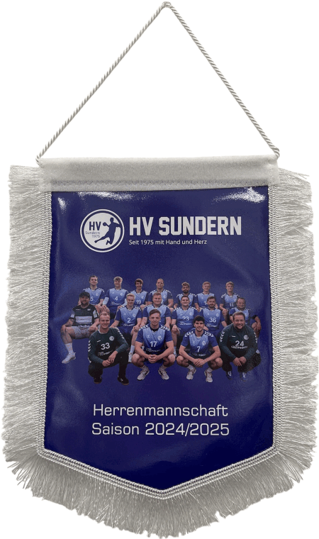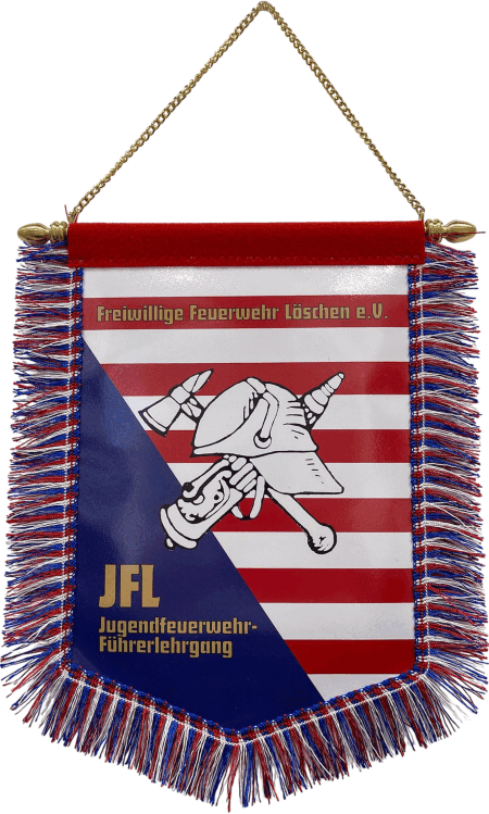 sein). Die Wimpel sind in einer wasserabweisenden Folie eingenäht. Das Abschlussband oben quer ist aus Velour oder Flausch. Bei der Aufhängung können sie zwischen einer ø3mm Kordel oder einer ø5mm Kette