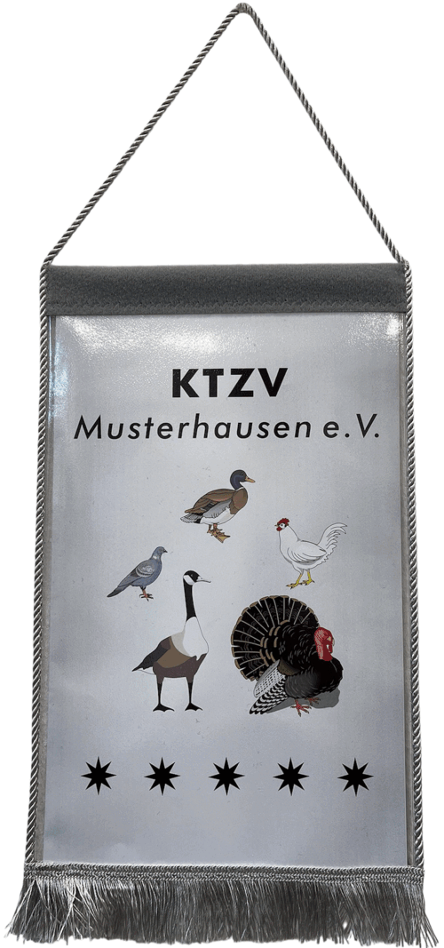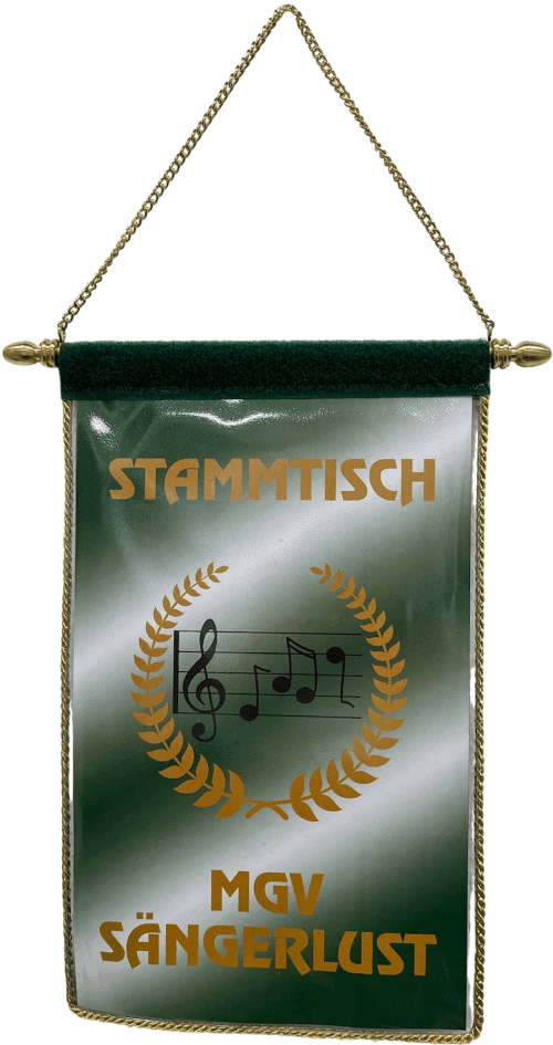 sein). Die Wimpel sind in einer wasserabweisenden Folie eingenäht. Das Abschlussband oben quer ist aus Velour oder Flausch. Bei der Aufhängung können sie zwischen einer ø3mm Kordel oder einer ø5mm Kette
